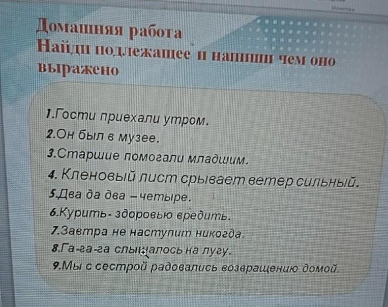 пж помогите Найди подлежащее и напиши чем оно Выражено 1.Гости приехали утром. 2.Он был в музее.